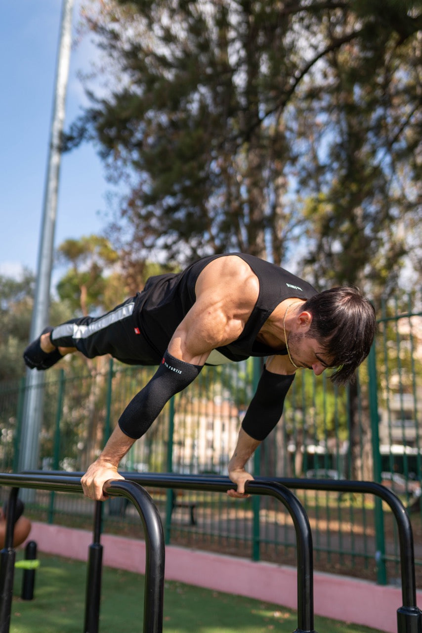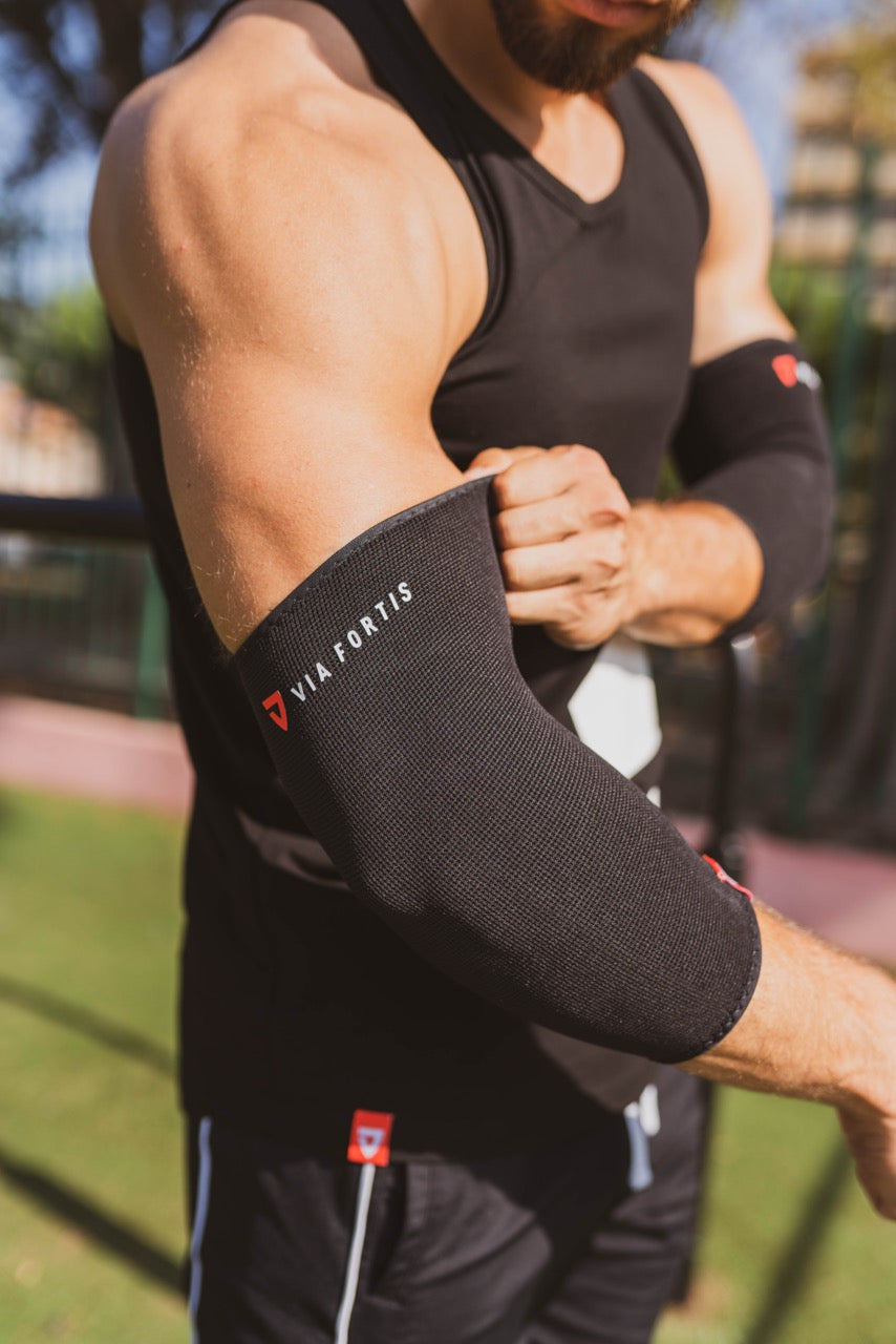 Améliore tes performances grâce aux coudières Via Fortis : elles soutiennent ton haut du bras, avant-bras et tes coudes pendant tes mouvements!