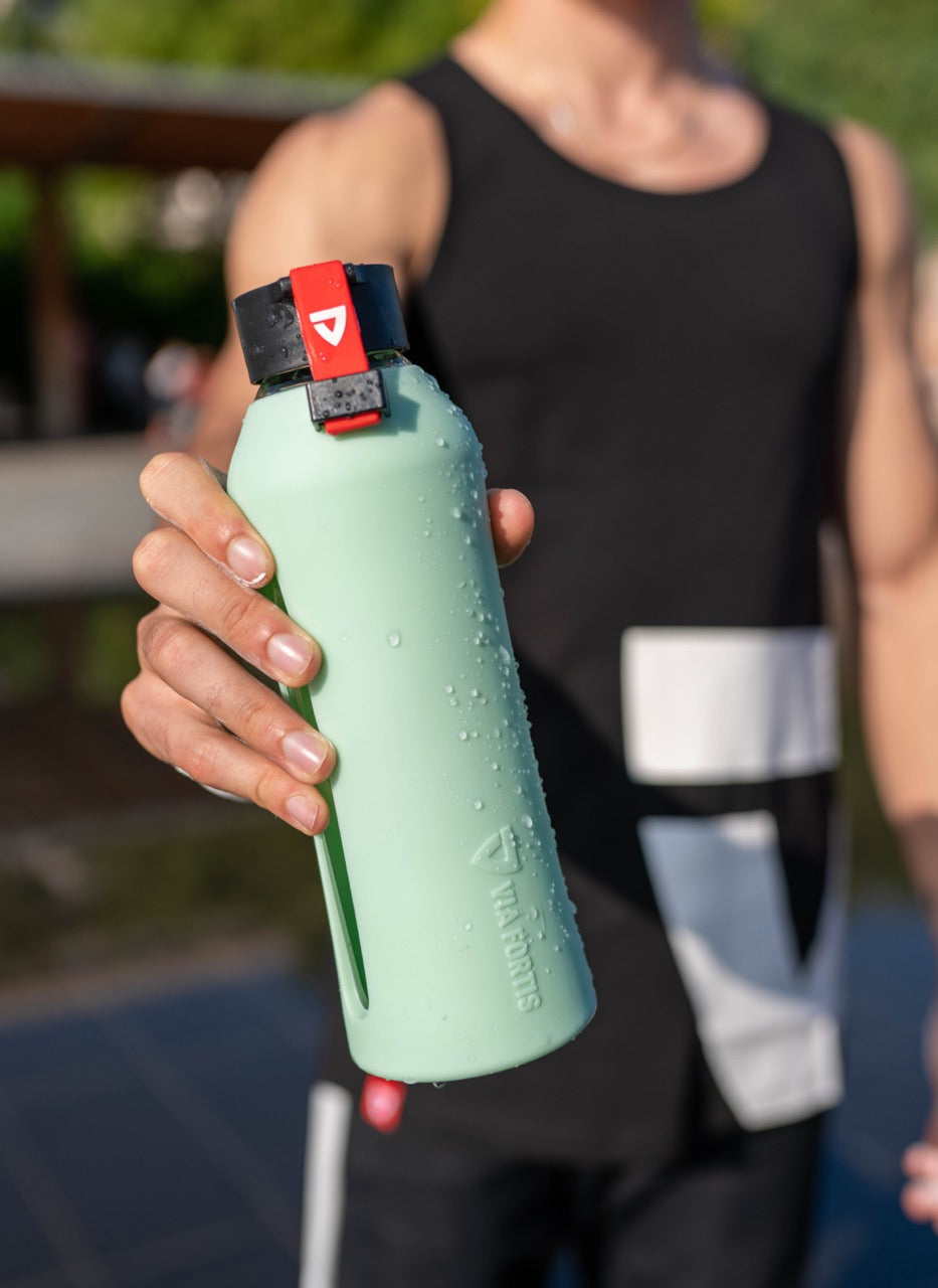 La Gourde de sport Via Fortis est d'une contenance de 550ml. Elle est composée à 100% de verre et est protégée par une enveloppe en silicone de haute qualité afin de la rendre plus résistante.